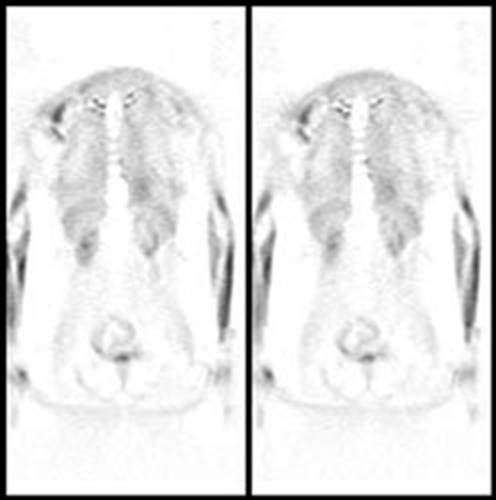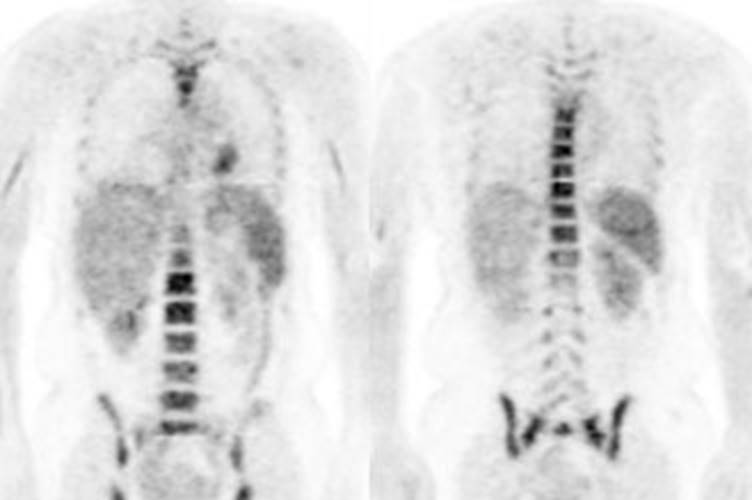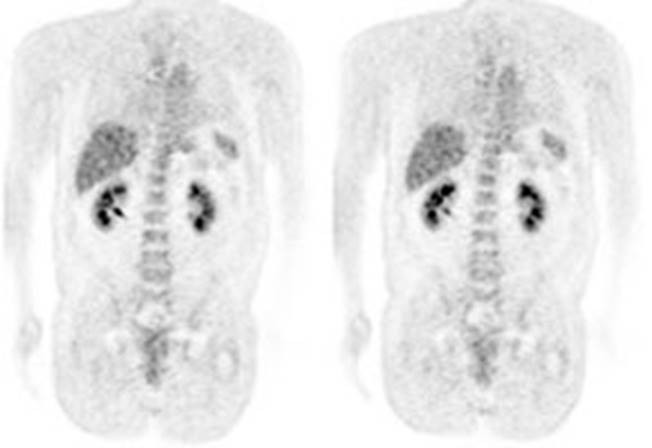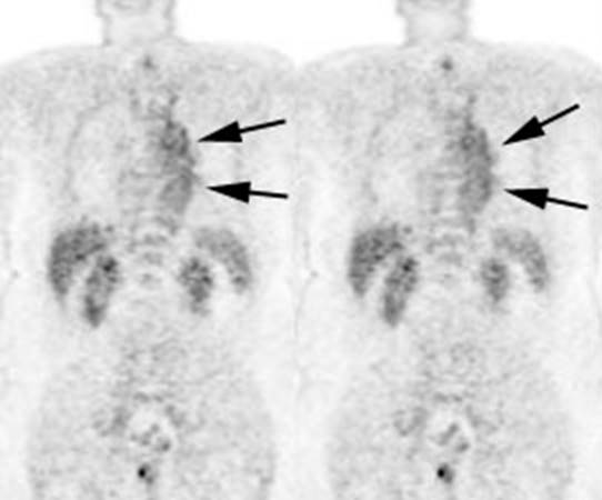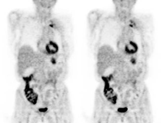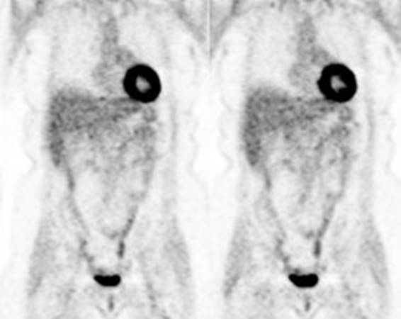 the same patient. The image on the left is non-attenuation corrected (the lungs
