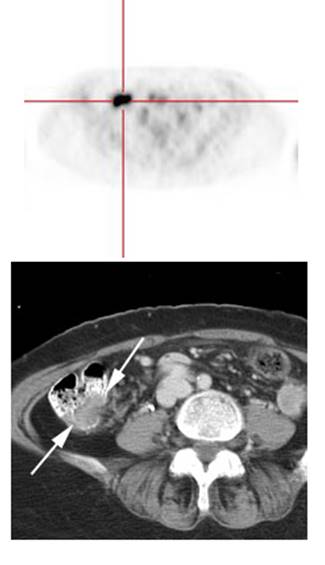 associated with colon cancer: This patient had focal tracer uptake in the region of the cecum. CT