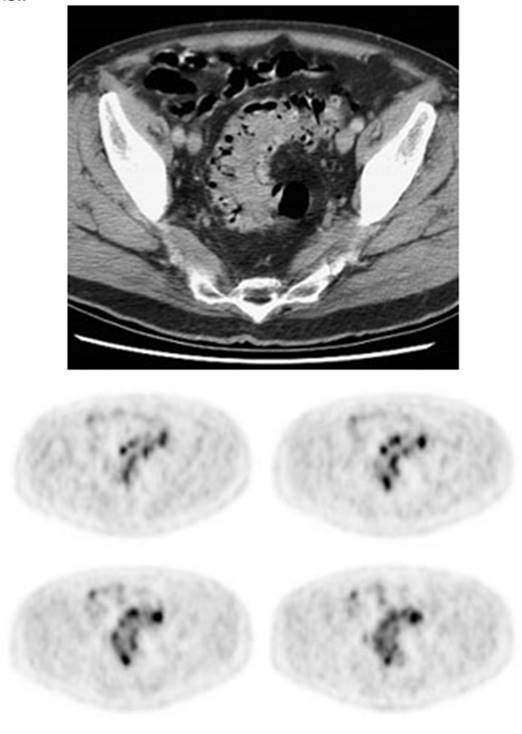 Note the segmental FDG uptake corresponding to an area of severe diverticular